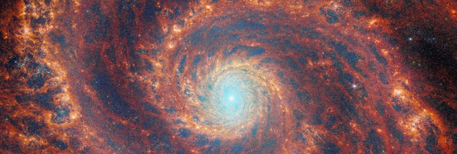 A galáxia — também conhecida como “Galáxia do Rodamoinho” ou “NGC 5194” — teve sua imagem de alta qualidade produzida a partir de dados coletados pela Câmera de Infravermelho Próximo (NIRCam) do Webb e seu Instrumento de Infravermelho Médio (MIRI).