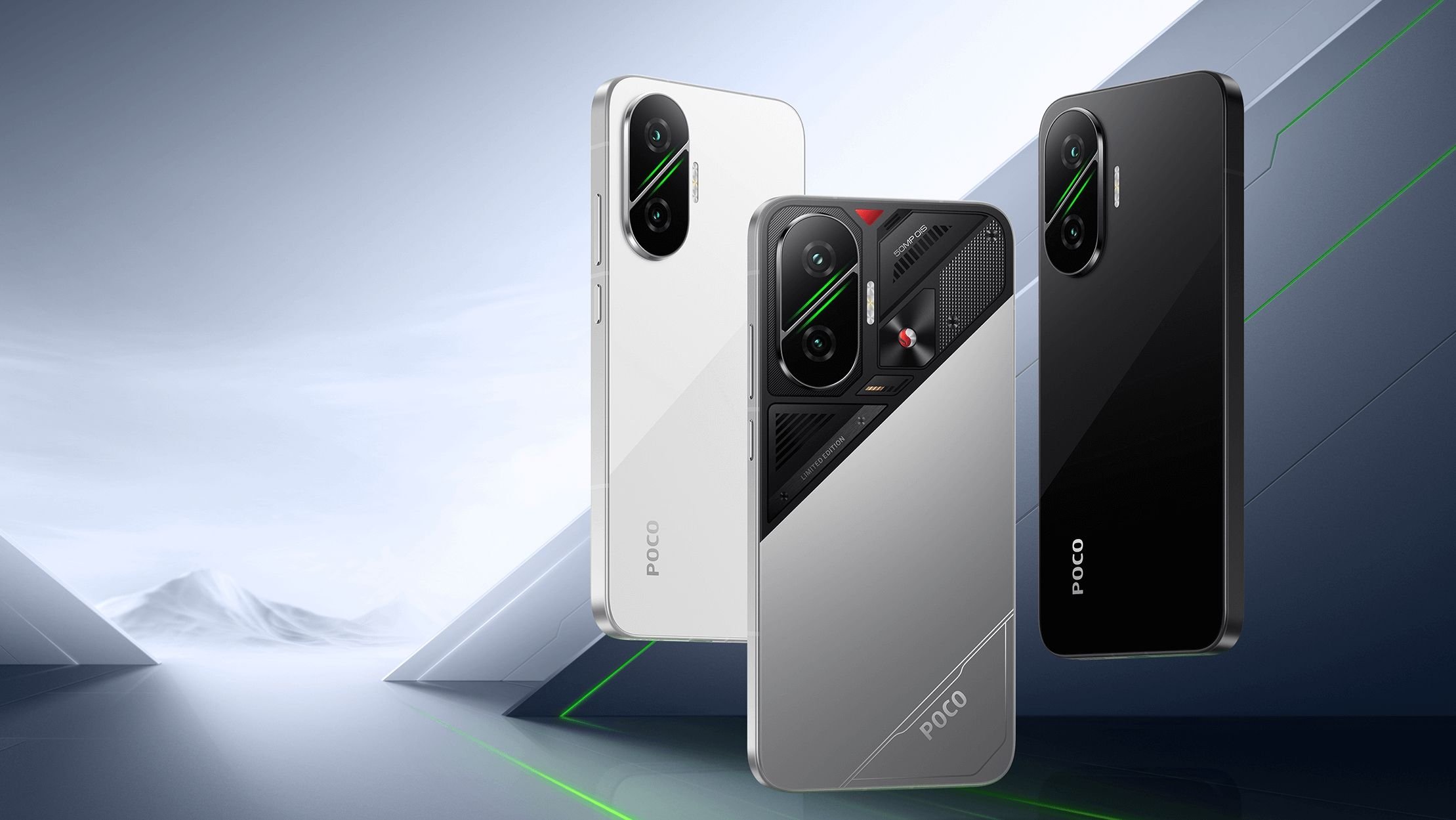 O POCO F7 se destaca pelo seu design arrojado, com módulo de câmeras em formato de pílula e uma faixa diagonal com detalhes verdes que lembram circuitos eletrônicos. A versão prata conta com acabamento especial gamer e traz elementos visuais em homenagem ao processador Snapdragon da Qualcomm, sendo uma edição limitada.
