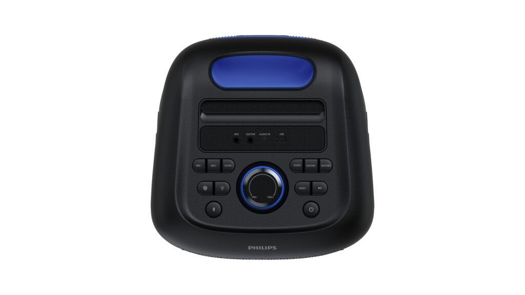 Para entretenimento extra, a Party Speaker TAX4000 vem com luzes que pulsam no ritmo da música, oferecendo 13 efeitos diferentes. Os fãs de karaokê podem usar microfone e guitarra com controle de volume e efeito de eco ajustável. O controle de música, som e luzes pode ser feito pelo aplicativo da Philips, garantindo praticidade e personalização.