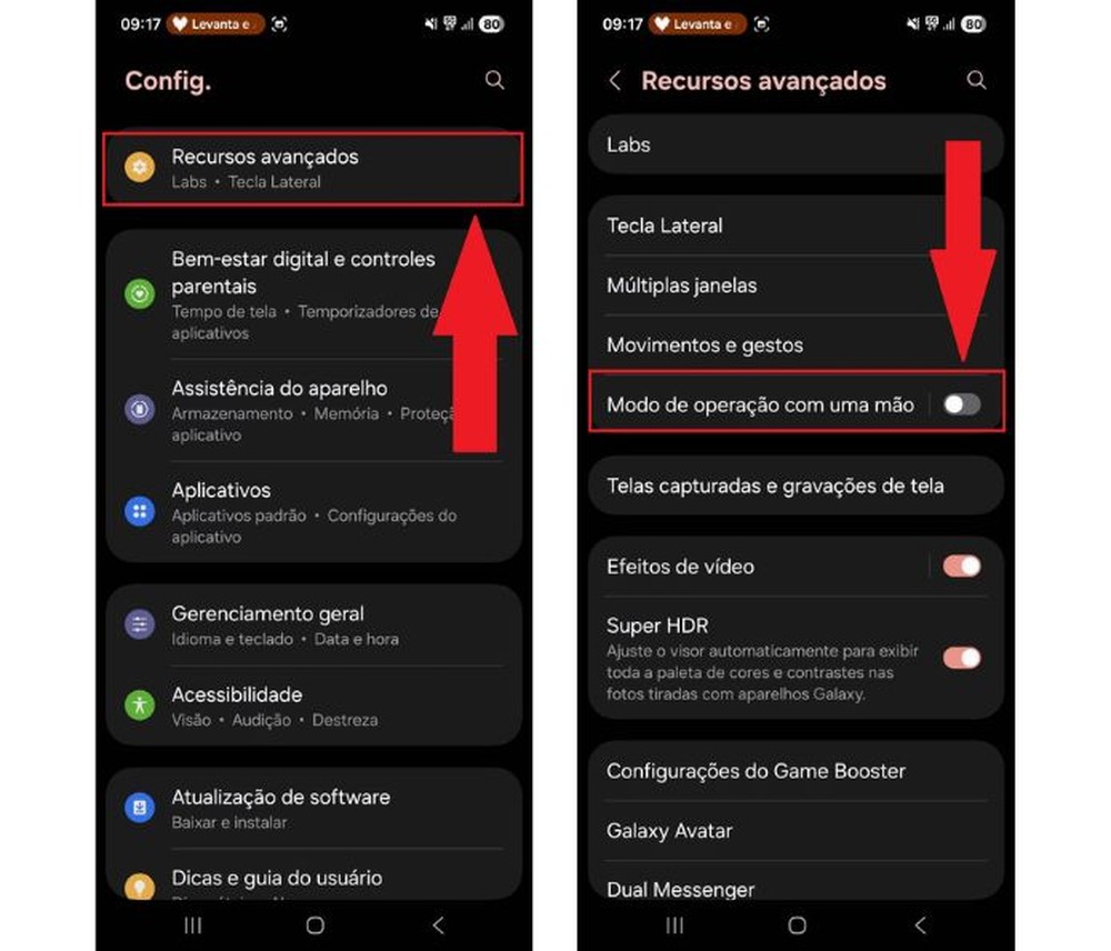 Ative em Configurações > Recursos avançados > Modo de operação com uma mão. A interface será redimensionada e, para retornar ao modo normal, basta tocar fora da área reduzida.