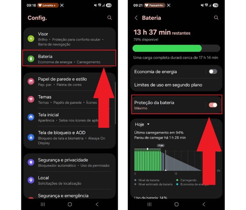 Para ativar, vá em Configurações > Bateria > Proteção da Bateria, habilite o botão e escolha a opção “Máximo”. Assim, o sistema limitará automaticamente o carregamento dentro da faixa ideal de preservação.