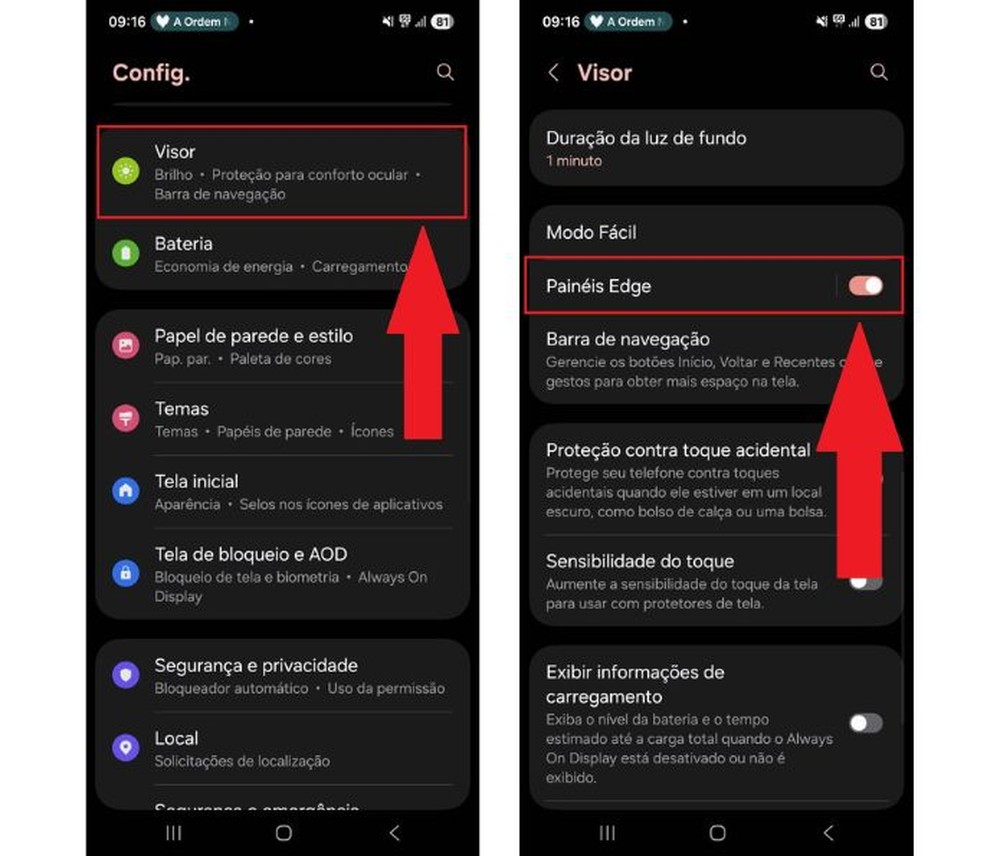 Para ativar, vá em Configurações > Visor > Painéis Edge e habilite o recurso. A partir daí, você poderá ajustar quais apps e funções ficam disponíveis na lateral da tela.