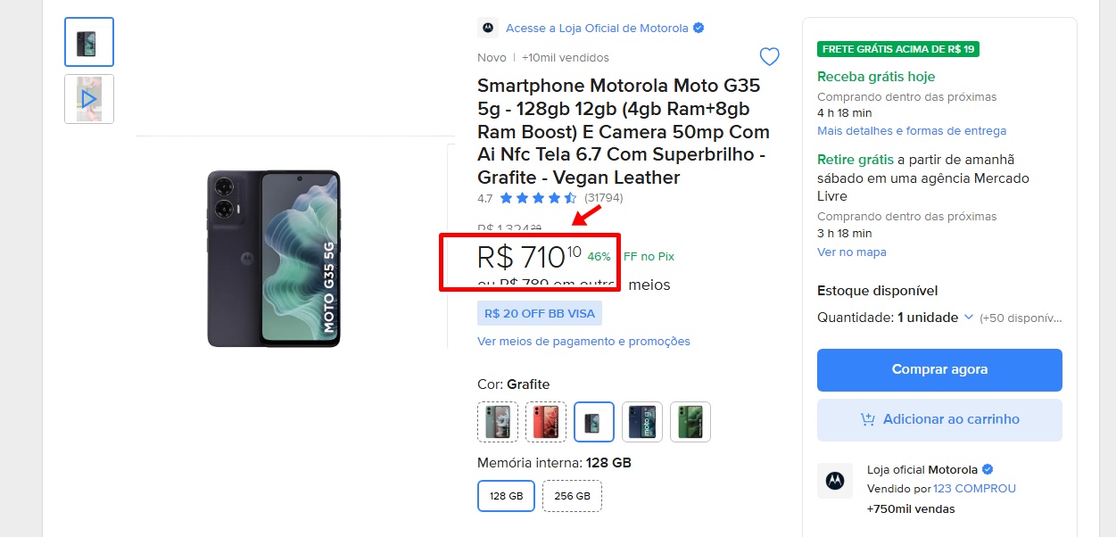 O modelo está sendo vendido pela loja oficial da Motorola dentro da plataforma, que acumula mais de 750 mil vendas e avaliação máxima, o que garante frete grátis e entrega rápida. Para quem prefere parcelar, o site oferece opções em até 18x no cartão do Mercado Livre ou 12x em qualquer cartão de crédito.