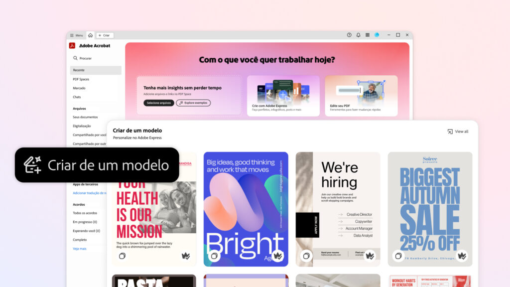 O Acrobat Studio integra os recursos premium do Adobe Express, permitindo transformar os insights obtidos em apresentações, posts, relatórios visuais e materiais gráficos com apenas alguns cliques. A plataforma inclui modelos profissionais, kits de marca e ferramentas de IA generativa, como Text-to-Image e Text-to-Video, impulsionadas pela tecnologia Adobe Firefly.