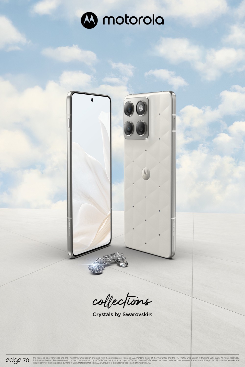 A Motorola eleva o design de seus smartphones a um novo patamar de luxo e sofisticação com o anúncio do motorola edge 70 em uma edição especial exclusiva. O dispositivo será lançado na cor PANTONE 11-4201 Cloud Dancer (Dançarino da Nuvem), eleita a Cor do Ano 2026 pela Pantone, e será adornado com cristais da Swarovski.