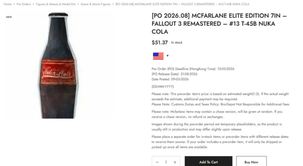 Usuários atentos descobriram que a famosa fabricante de brinquedos McFarlane Toys incluiu o nome “Fallout 3 Remastered” em uma página de produto para uma nova figura de ação de Nuka Cola. O título aparece de forma explícita na listagem oficial: “MCFARLANE ELITE EDITION 7IN – FALLOUT 3 REMASTERED”.